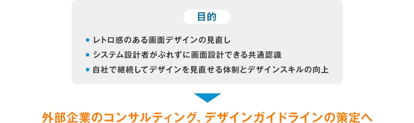 そこで、外部のデザイン会社からコンサルティングを受けることで、自社でシステムのデザインスキルを向上させていく上での指針となる「デザインガイドライン」の策定に乗り出しました。