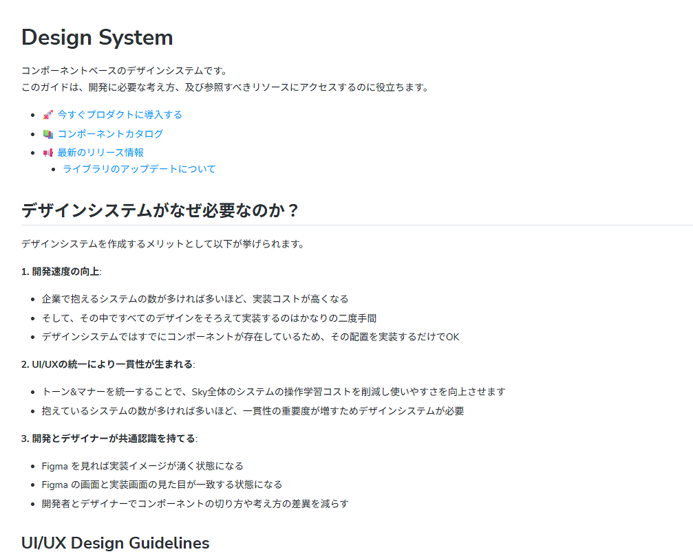 デザインシステムについて知ってもらうことから使ってもらうところまでサポートできるように、ドキュメントを充実化させていきました。とりあえず、ドキュメントを読めば始められる! という状況になるよう、Storybookに開発者向けのドキュメントを追加しました。