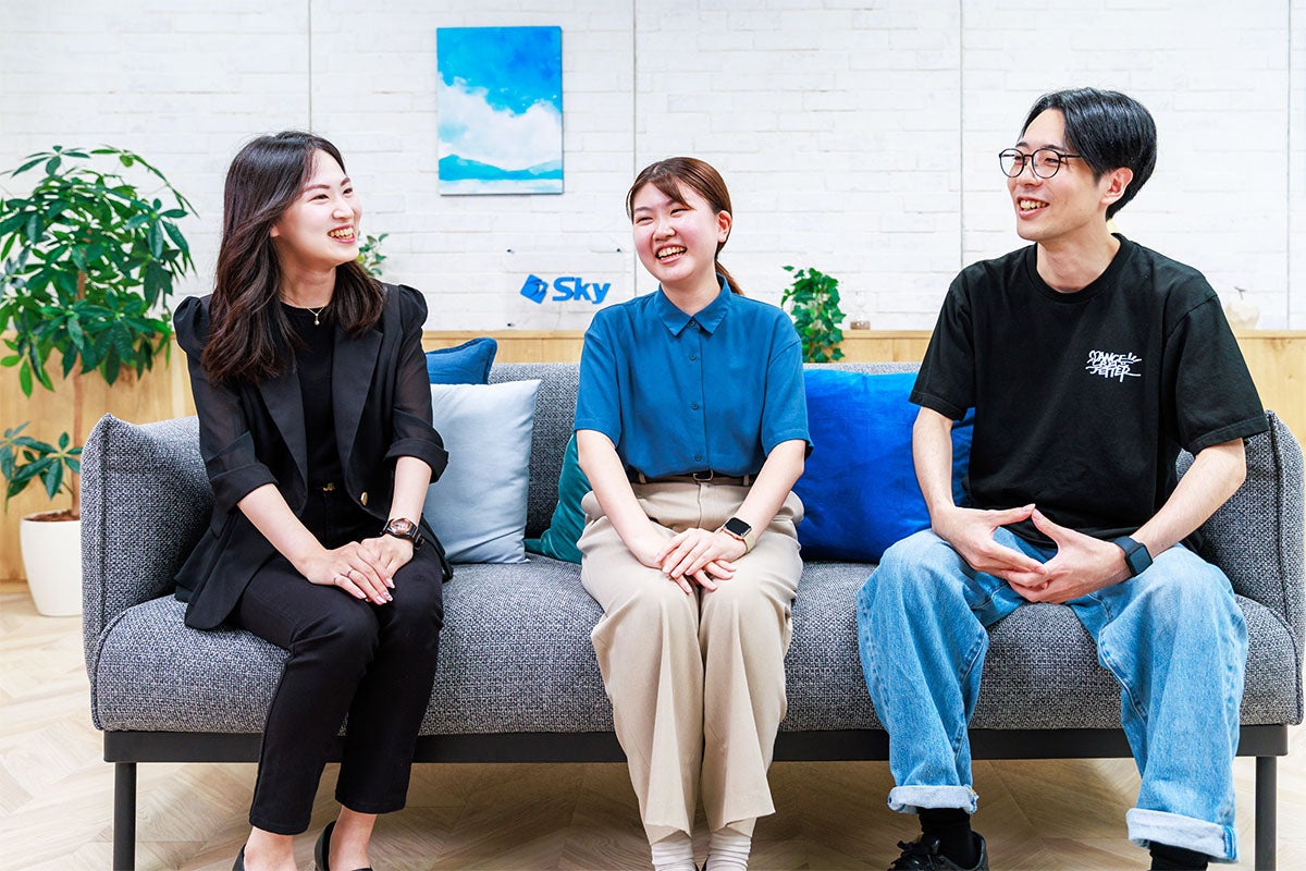 入社2年目ながらもそれぞれの現場で活躍している社員3人ずつにインタビュー。事前にお渡ししていたヒアリングシートに沿って、入社して感じたSky株式会社の特徴や社風、働きやすさなどを聞きました。