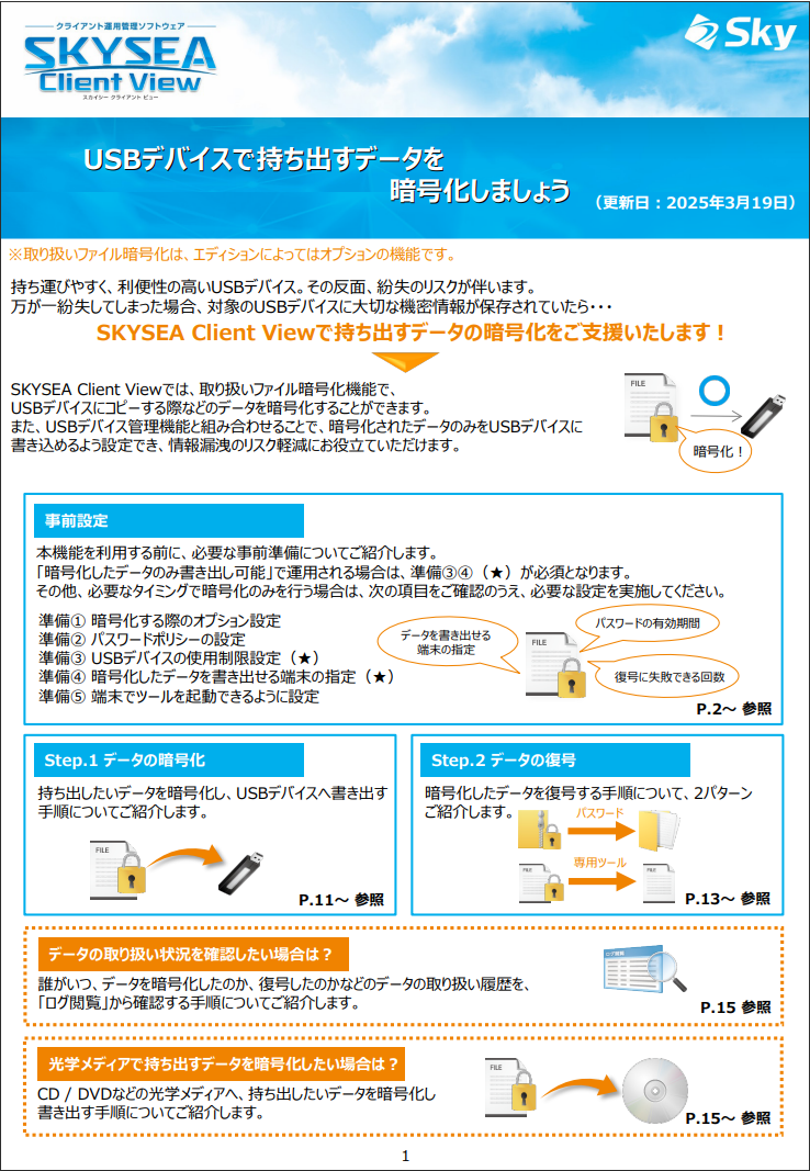 「SKYSEA Client View」や「SKYPCE」等の自社商品の運用シーンに沿った操作・設定をご紹介するガイドです。