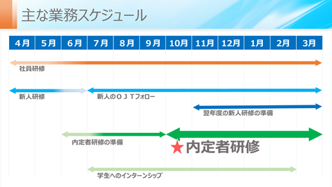 - アンケート入力 内定者研修は内定者の希望日に合わせて随時実施しているため、10~11月は上記のような初参加時の対応を毎日のように実施しています。