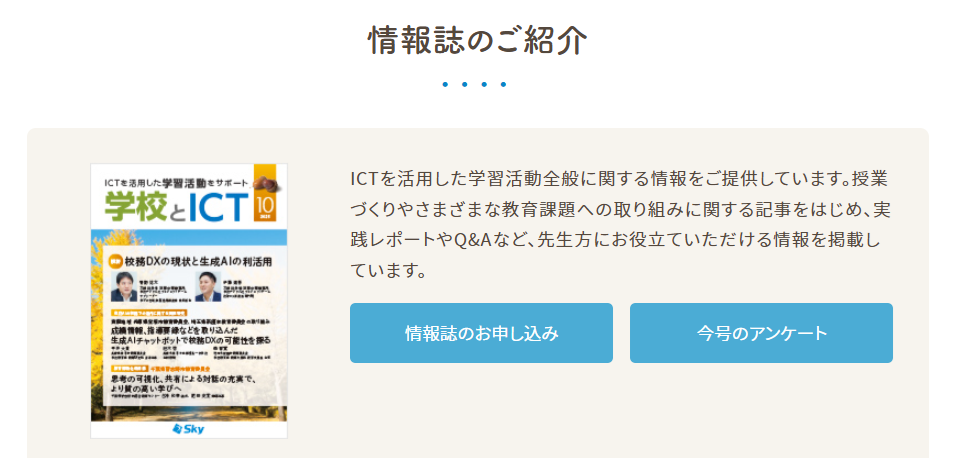 『学校とICT』は、Sky株式会社が発行する、教育現場におけるICT活用を支援する情報誌です。偶数月に年6回発行されており、全国の教育委員会や学校の教職員を対象に、約5万部を無料で配布しています。