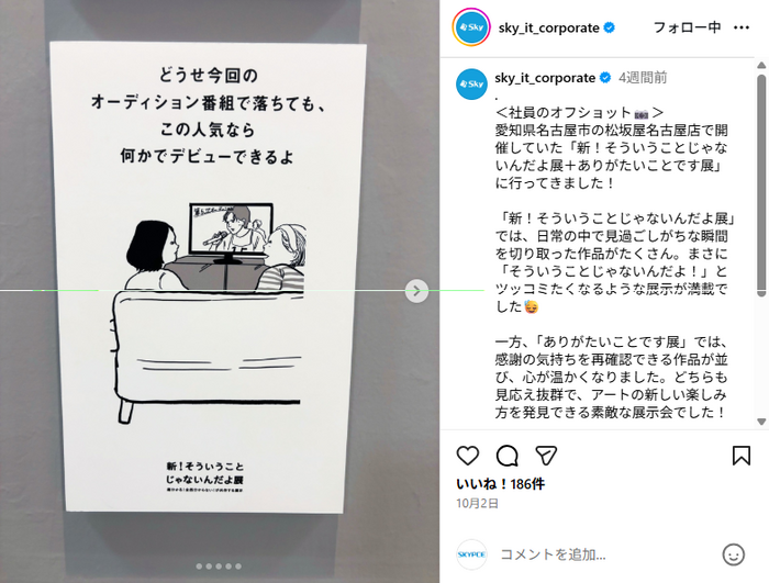 InstagramのSky株式会社 公式アカウントでは、ほかにもさまざまなオフショットやキャンペーンの開催、会社の最新情報なども発信中です!ぜひご覧ください✨