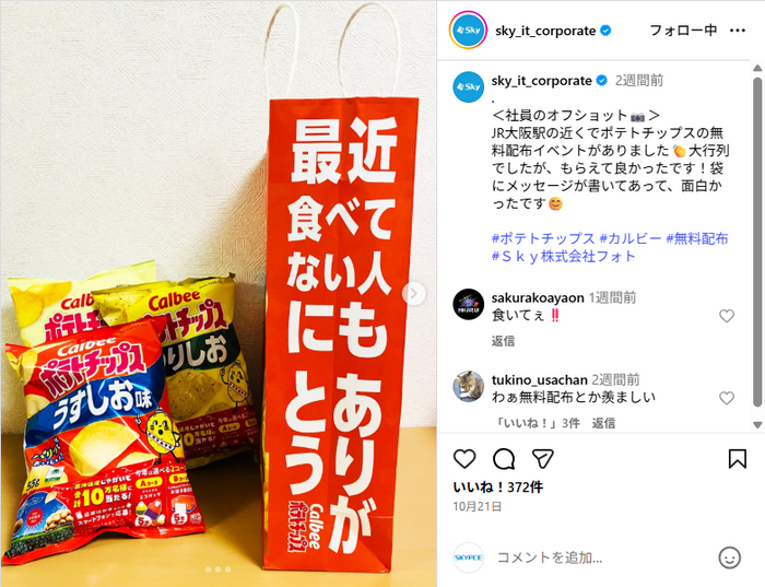 皆さん、こんにちは! InstagramのSky株式会社 公式アカウントでは、日々「社員のオフショット」を投稿しています☺社員がお休みの日に行ったお出かけスポットや購入品など、さまざまな一面を垣間見ることができ、Instagramを運営している私(中の人)も、行ってみたい!買ってみたい!と思うことがあります。