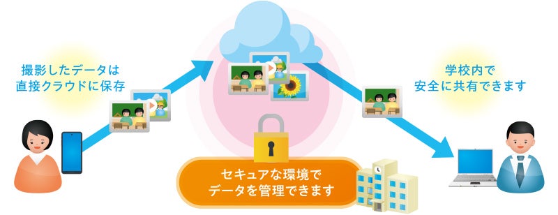 近年、学校で私用スマートフォンの利用に関する不祥事が問題となっています。 皆さんもニュースなどでご存じの方が多いのではないでしょうか。 そこで、「SKYMENU Mobile」には、教職員が学校用スマートフォンで撮影した写真・動画を、 あらかじめ指定した共有ドライブ(クラウド)に保存し、組織でデータを管理できる「セーフカメラ」機能を搭載しました。 端末内に撮影データを残さない仕組みのため、子どもたちの写真・動画の漏えいリスクを減らすとともに、 カメラ機能の不適切な利用を防ぎます。