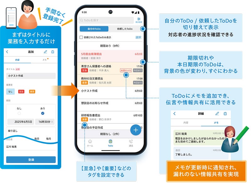 一人の教職員が抱える業務は、授業研究、授業案やテスト、お知らせプリントの作成、研修資料の作成、 保護者からの問い合わせ対応など、多岐にわたります。 そこで、簡単に自分の業務を登録したり、ほかの先生に業務を依頼できたり、 管理職がそれぞれの負荷状況を把握できたりする「ToDoプラス」機能を備えました。