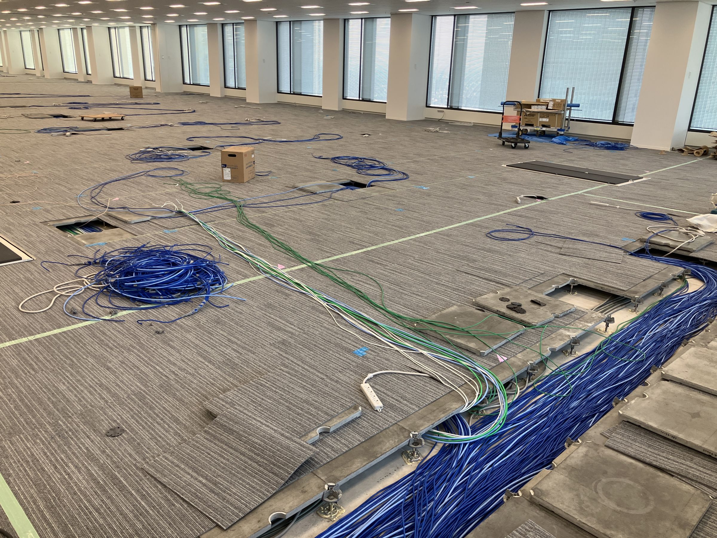 レイアウトが決まり、業者様に依頼して、工事が始まりました。 電気やネットワーク、固定電話用のケーブルを「OAフロア」と呼ばれる床の下に通していきます。