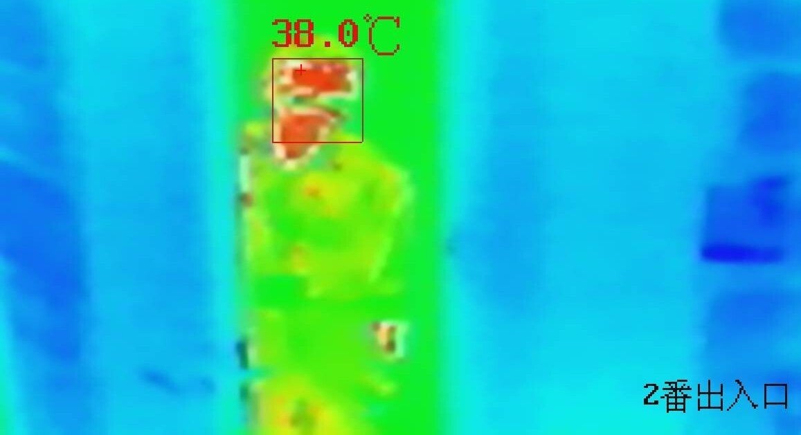 Sky株式会社では、居室の入り口にサーマルカメラを設置。 上の画像のように、37.5度以上の人が扉を通り居室内に入ろうとすると 検知・発報するように設定しています。
