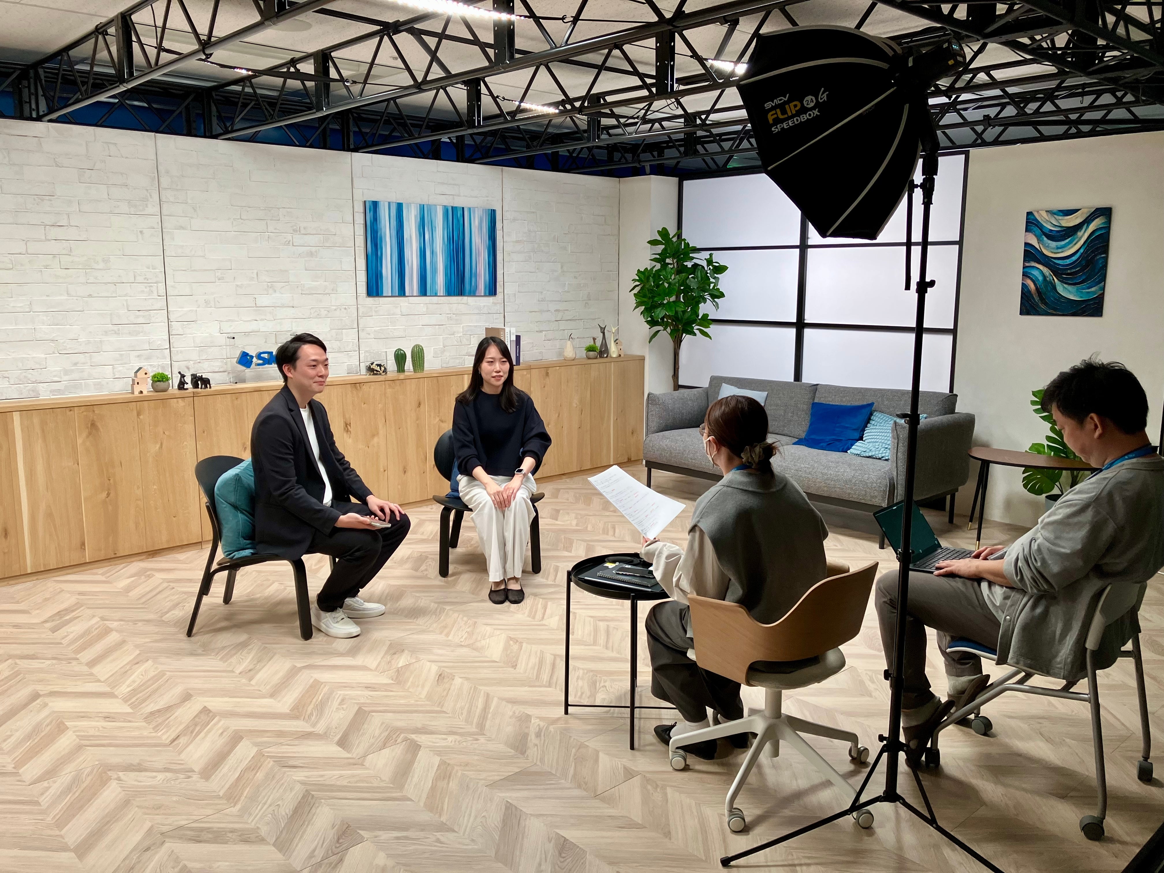 こうした状況のなか、Sky株式会社でもリファラル採用を積極的に実施しています! 今回の対談取材は、紹介された人として私と同じ広報部のTさん、紹介した人としてクライアント・システム開発事業本部のHさんが協力してくださいました! 今回も、「クロストーク・若手のホンネ座談会」のときと同じ、20階のスタジオで取材・撮影を行いました。
