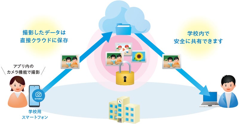 そこで注目されるのが、学校用スマートフォンですが、子どもたちの活動を素早く、いつでもどこでも撮影できる一方、撮影データは端末内に保存されるため、やはり紛失時の情報漏えいリスクは避けられません。このような悩みを解決するのが、「SKYMENU Mobile」の「セーフカメラ」です。