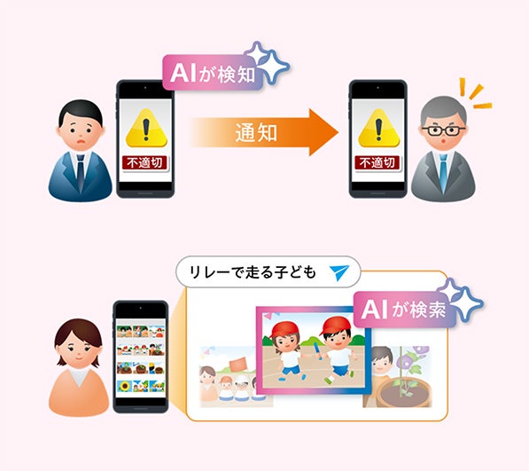 今後は、AIを活用した機能を搭載します。それが「AI検知」と「AI検索」です。「AI検知」では、撮影されたデータからAIが不適切な画像・動画を判定し、撮影者と管理者の両方にアラート通知。不適切な撮影の抑止につなげます。