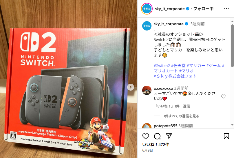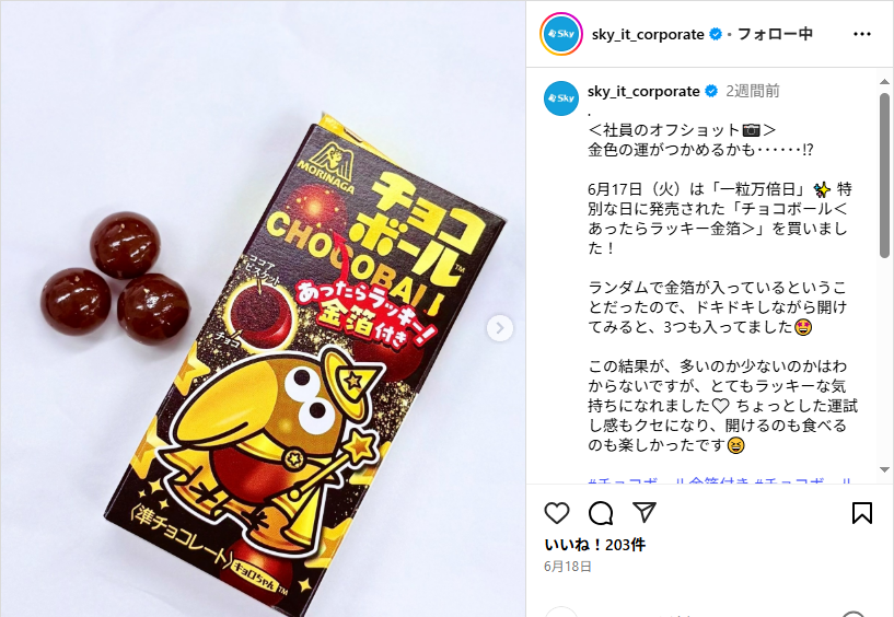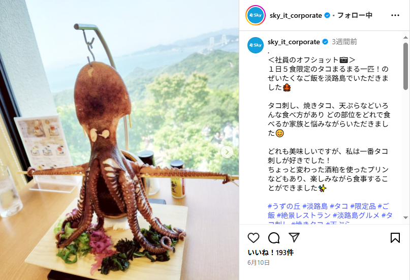 皆さん、こんにちは! Sky株式会社の公式Instagramでは、日々「社員のオフショット」を投稿しています☺社員がお休みの日に行ったお出かけスポットや購入品など、さまざまな一面を垣間見ることができ、Instagramを運営している私(中の人)も、行ってみたい!買ってみたい!と思うことがあります。せっかくなので、6月投稿分(5/26-6/25)でいいね数の多かった投稿を皆さんにも紹介します!