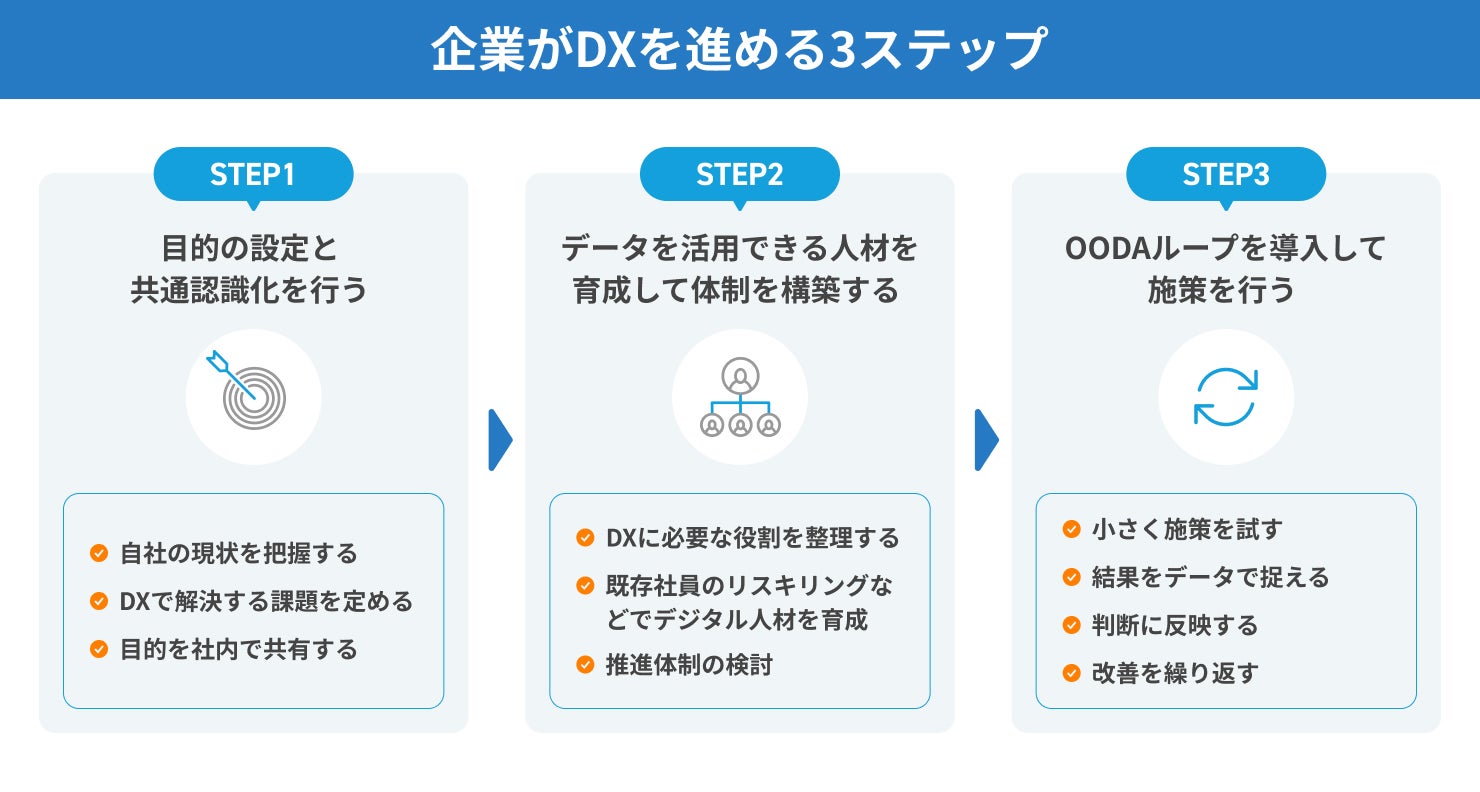DXは、最新技術を導入すればすぐに成果が出るものではありません。重要なのは、自社の目的や課題を踏まえた上で、段階的に取り組みを進めることです。ここでは、企業がDXを導入する際に押さえておきたい基本的なステップとして以下の3つを紹介します。