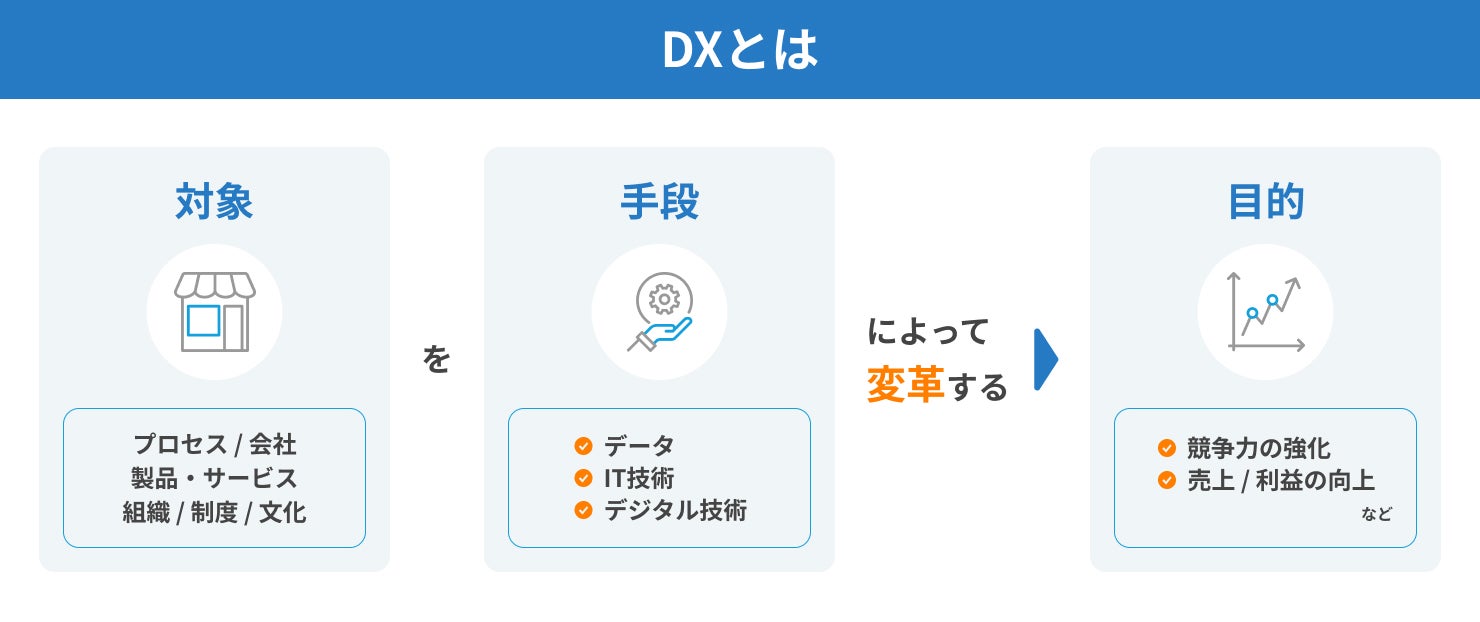 今回はDXについてご紹介しました。DXは「IT技術の導入により新たなデジタル時代を生き抜くための取り組み」であり、企業が今後も成長していくためには避けては通れない道です。従来のビジネスモデルに依存し続けた場合、企業が競争力を失う可能性もすでに現実的なりつつあります。