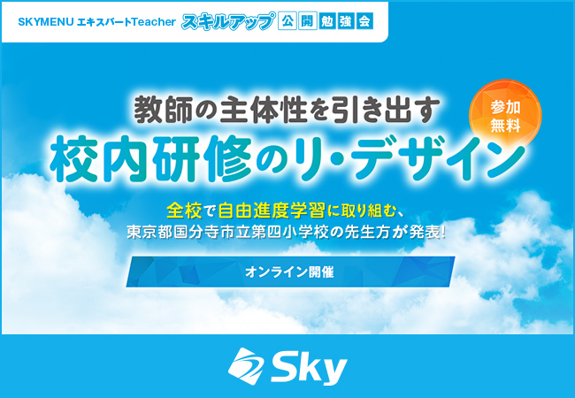 Sky株式会社は、ICTを日常的に活用する「スキル」を持ち、学びに対する「熱意」を発揮して、「創意工夫」に満ちた授業デザインによって子どもたちの学びを支えている先生方を対象に「SKYMENU エキスパートTeacher」認定制度を実施しています。条件を満たして申請をしていただくと、審査の上で「SKYMENU エキスパートTeacher」に認定いたします。「SKYMENU エキスパートTeacher」の先生方には、実践事例の発信や情報誌の取材など、さまざまな取り組みにご参画いただく機会を設けています。また、先生同士が交流できる場もありますので、情報収集やスキルアップにお役立ていただけます。
