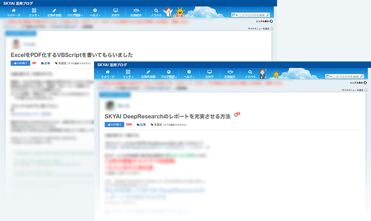 2023年11月にリリースした社内向け生成AIサービス。社内情報がそのまま活用できるよう情報セキュリティに配慮した設計で、安心して業務に活用できる環境を整えました。さらに、2025年8月には、AIが関連情報を自律的に収集・分析し、レポート形式で出力する「SKYAI Deep Research」もリリース。全社員が、自身の業務の生産性向上のために、思うようにAIが活用できる環境を整えています。