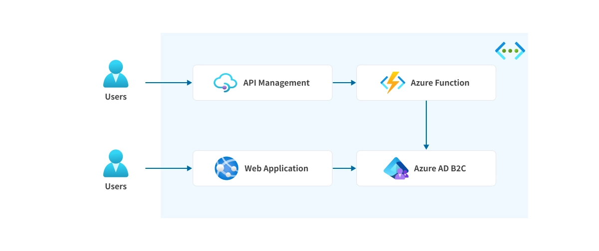 Azureシステム構成の一例をご紹介します。この例は基本的な構成ですが、各カテゴリごとに最適なサービスを選定し、組み合わせることで、お客様の要求やご要望に応じた構成をご提案いたします。