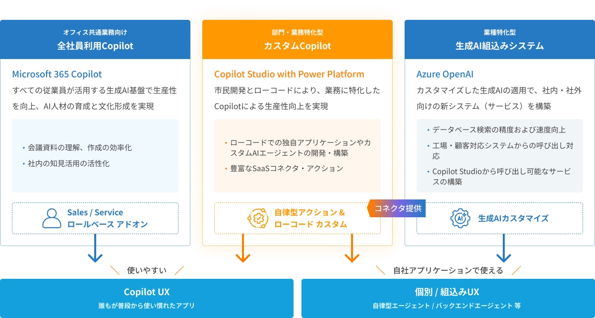 Microsoftサービスとの親和性、UI / UXでなく業務プロセスに主眼を置く場合や、すぐに生成AIの実証検証を行いたい場合は、まずCopilot Studioを利用したスモールスタートで効果測定を行います。