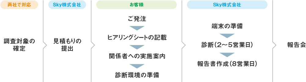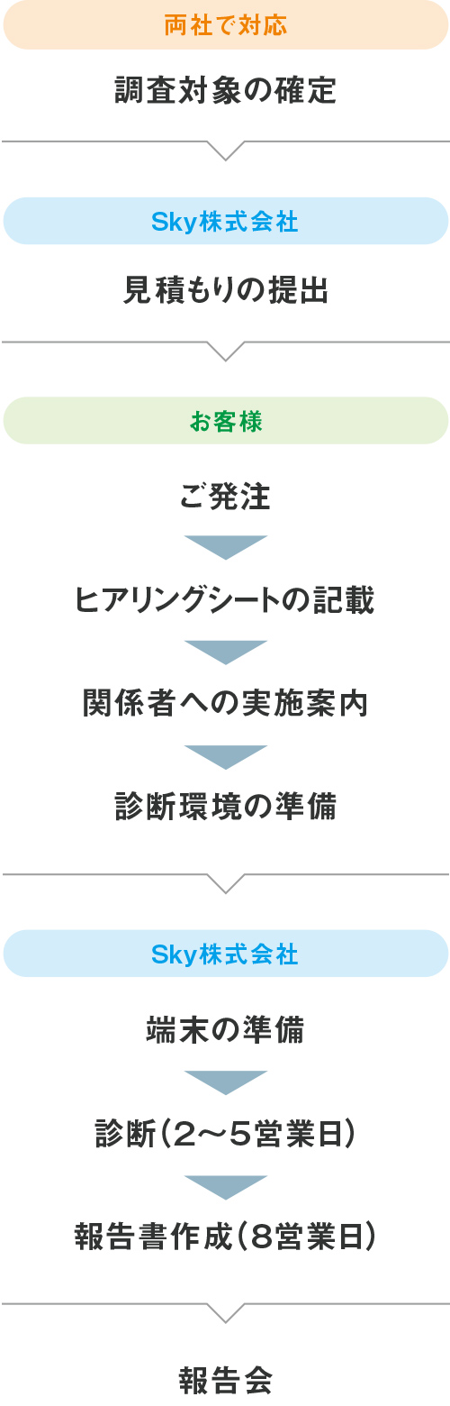 iOS / Android用のアプリケーションについて、手動および自動ツールで脆弱性を検出します。高いレベル(CRITICAL)の脆弱性が検出された場合、診断最終日前後に速報を提出します。