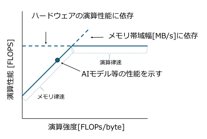 ルーフラインモデルは、AIモデル等のアプリケーションやGPUの並列処理のプロセス等の性能を見るために使用されるモデルです。 一般的には以下のような図で表されます。 ※簡易的に分かりやすくした図です。正確な内容等は書籍などをご参考ください。