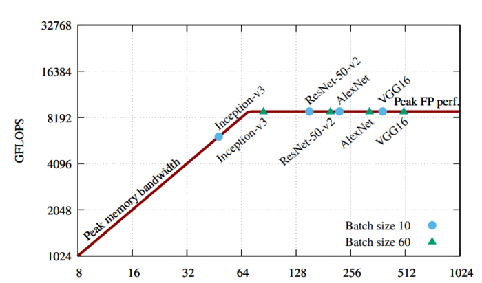 この図だとほとんどのモデルが演算律速であることが分かります。 Inception v3は、最後の方で畳み込みレイヤーのサイズやカーネル数が小さくなるため、メモリ律速となりがちなようです。