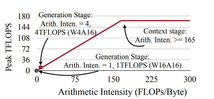 Generation Stageはメモリ律速であることが分かります。 LLMでは自己回帰的に次のトークンを生成する都合上、並列実行ができないため、Generation Stageではメモリ律速になりやすいようです。 よくLLMを高速化するために重みだけを量子化するケースがありますが、これは重みを量子化することで、演算器に転送するデータ量が減り、データの転送待ちが軽減されるためです。