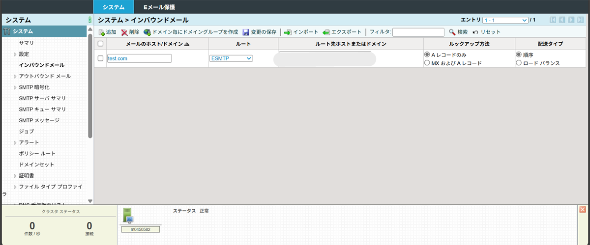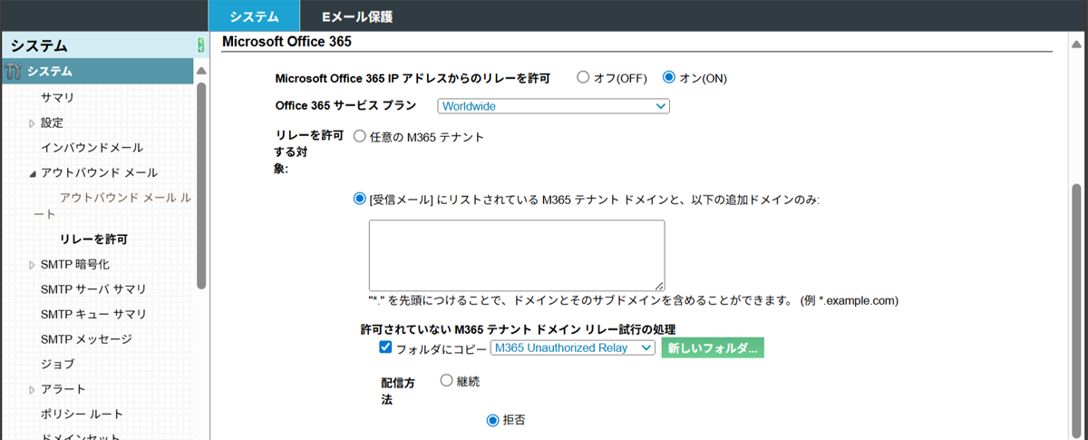 リレーを許可する対象:[受信メール]にリストされているM365テナントドメインと、以下の追加ドメインのみ:インバウンドメールで登録したドメイン以外を登録する場合は個別に登録