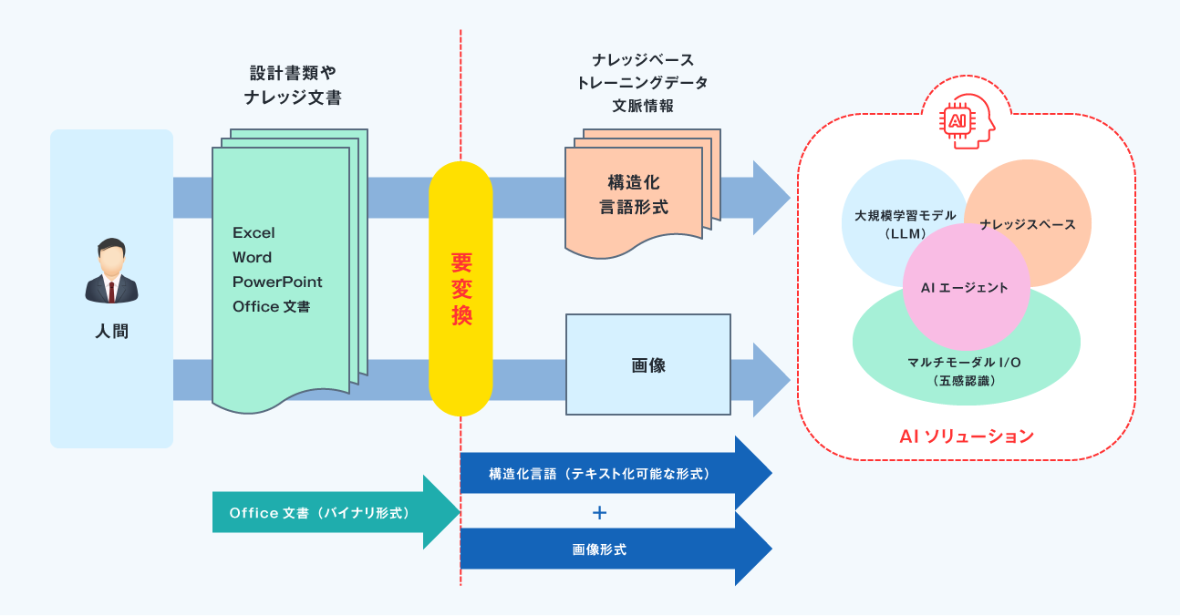 というのも、クラウド型生成AIやエッジ、オンプレ型生成AI、いずれもプロンプト駆動やエージェント駆動、どんな駆動方式であっても、大規模学習モデルに最終的にいきわたるのは結局『テキスト言語』であって、ExcelやWordなどバイナリ形式のファイルを直接AIは読めず、一度マークアップ言語や、表の場合はreStructuredText、HTMLやUML、XMLやJSON、CSVなど、テキスト変換できる『構造化言語形式』に一度変換しないとAIモデルが解釈できない問題があり、このインパクトをもろに受けてしまっているのが現状のようです。
