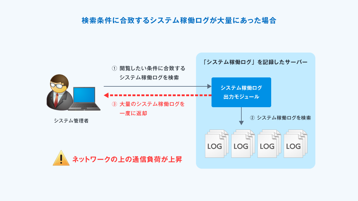 単純に検索条件に合致する「システム稼働ログ」を管理コンソールに返却しているだけの場合、 検索条件にヒットする「システム稼働ログ」が大量にあると、どのような事態が起こりうるでしょうか。