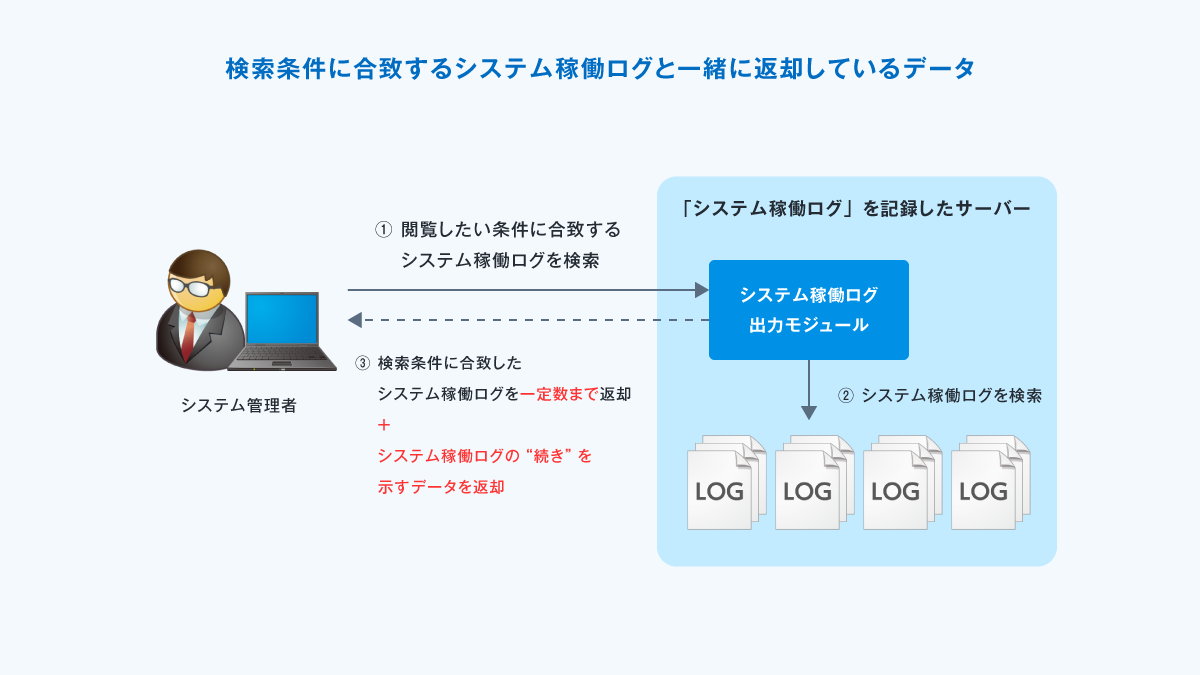 管理コンソール側は検索条件に合致する「システム稼働ログ」を受け取った際、”続き”を示すデータを併せて受け取ったら、 続きの「システム稼働ログ」の取得を再度サーバーに要求します。