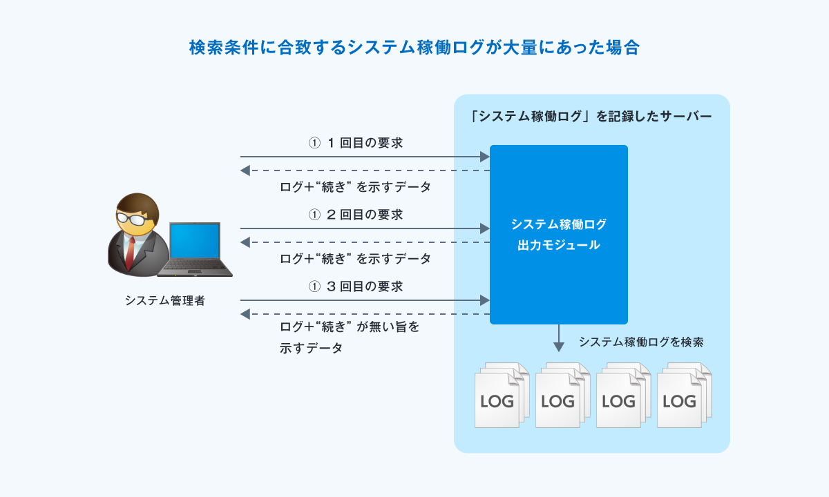 この処理を繰り返し行い、検索条件に合致する「システム稼働ログ」を最後まで受け取ったらサーバーへの取得要求を終了します。 このようにすることで、一度の通信で大量のデータがネットワーク上に流れることを防いでいるのです。