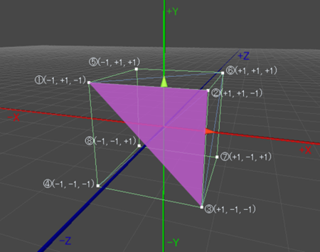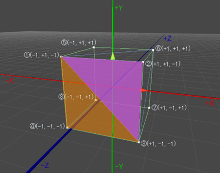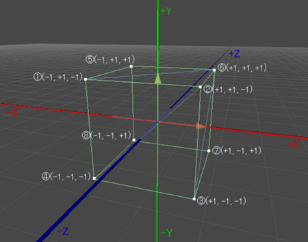 前回、3D空間上で立方体を登場させるためには、以下の通り3D空間上に8個の頂点(①~⑧)を指定する必要があると説明しました。