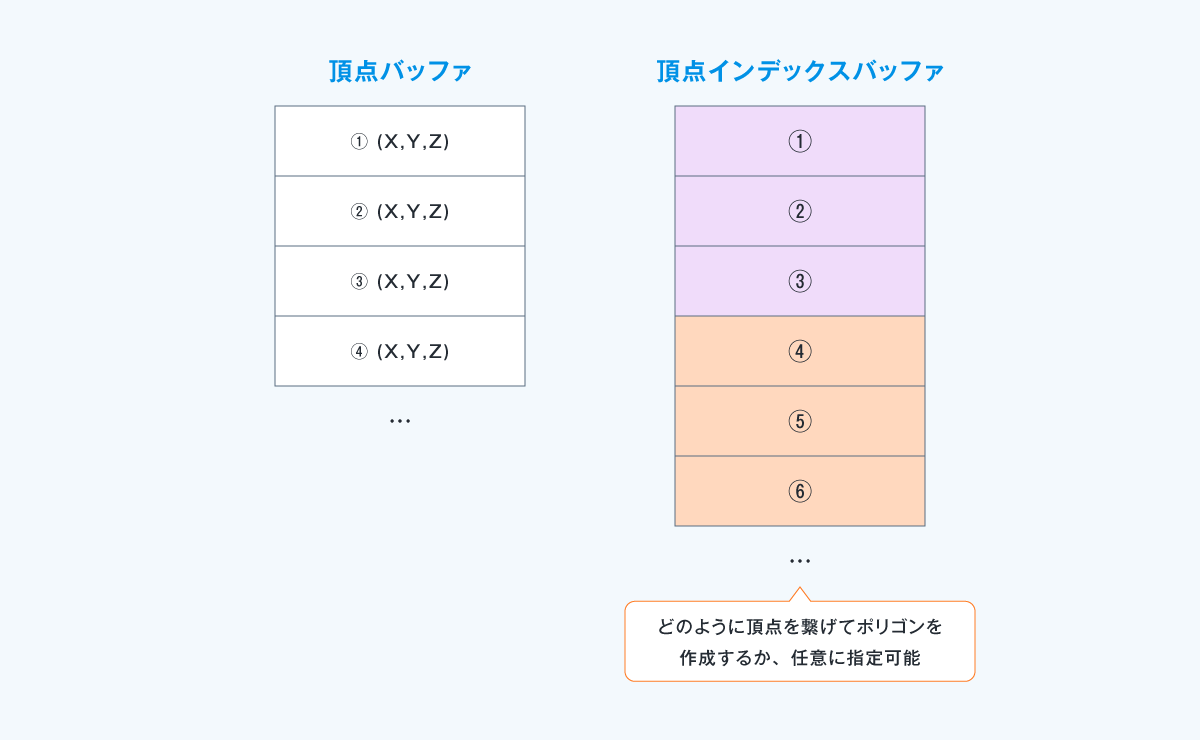 “頂点バッファ”は、頂点の座標(X, Y, Z)を格納するための領域です。