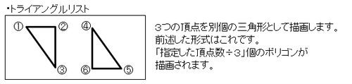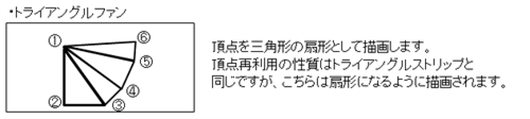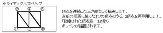 これについては、3D描画エンジン側に「頂点をどのように結んでポリゴンを作るか」を指定する仕組みが設けられており、複数の三角形ポリゴンを少ない頂点数で、まとめて描画することもできるようになっています。