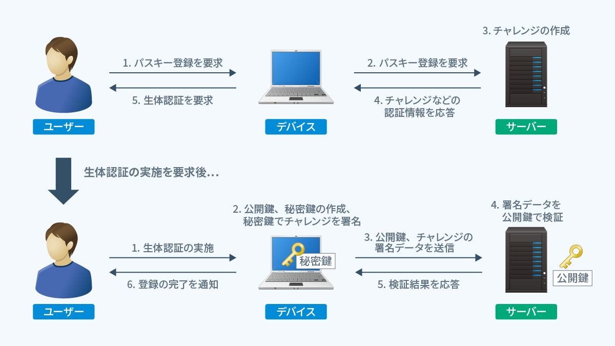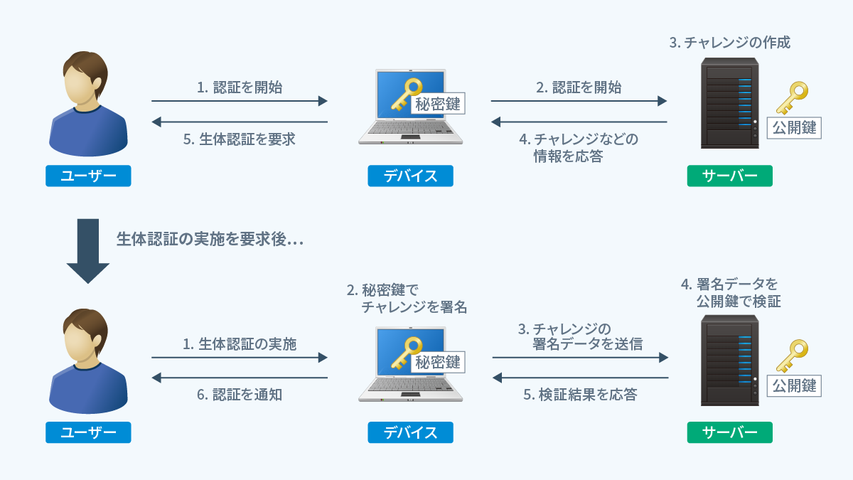 利用に際しては、登録フェーズや認証フェーズに分かれます。登録フェーズでは、認証器の情報をサーバーとの関連付けを行い、認証フェーズでは、関連付けした情報を利用して認証します。