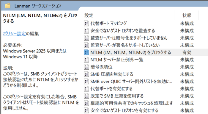 Windows Server 2025 および Windows 11 バージョン 24H2 では NTLM認証の段階的な廃止に向けた取り組みが進められており NTLMv1は削除され、端末側にてSMBクライアントでNTLMの利用をブロックする 「NTLM (LM、NTLM、NTLMv2)をブロック する」グループポリシー機能が追加されています
