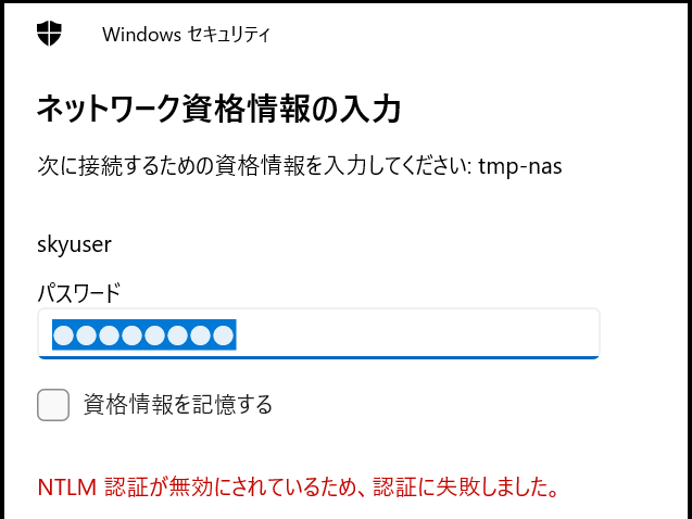 上記グループポリシーを有効化された端末からNTLM認証でファイルサーバーへ アクセスすると下記エラーで端末へ通知されます。