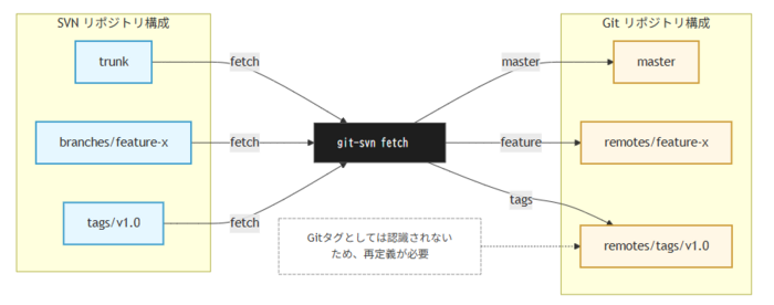 - SVN の Trunk、ブランチ、タグが、Git 側では master、リモートブランチ、およびタグ相当の参照として変換・生成されていることを確認します。 以下は、git-svn による標準レイアウトの変換結果を概念的に示した図です。