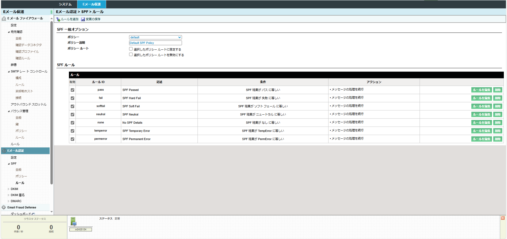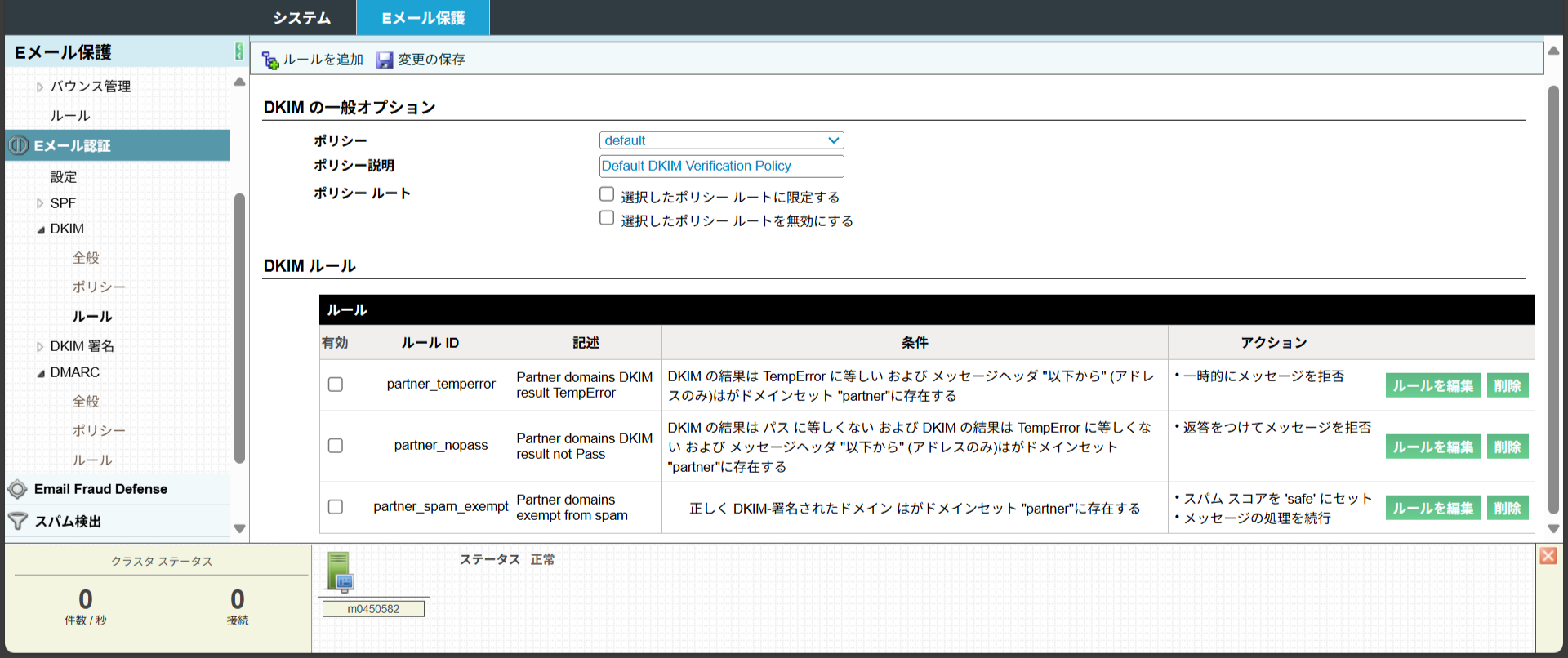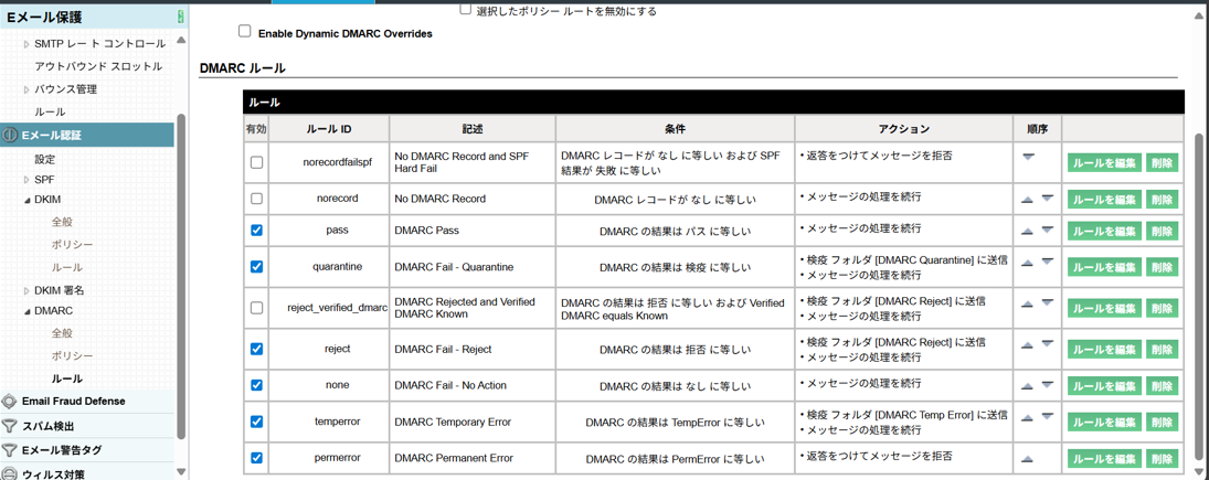 今回はDMARCを使用する想定なので、結果にかかわらず「メッセージの処理を続行」の設定にしています。ルールの追加や編集は環境に合わせて行ってください。