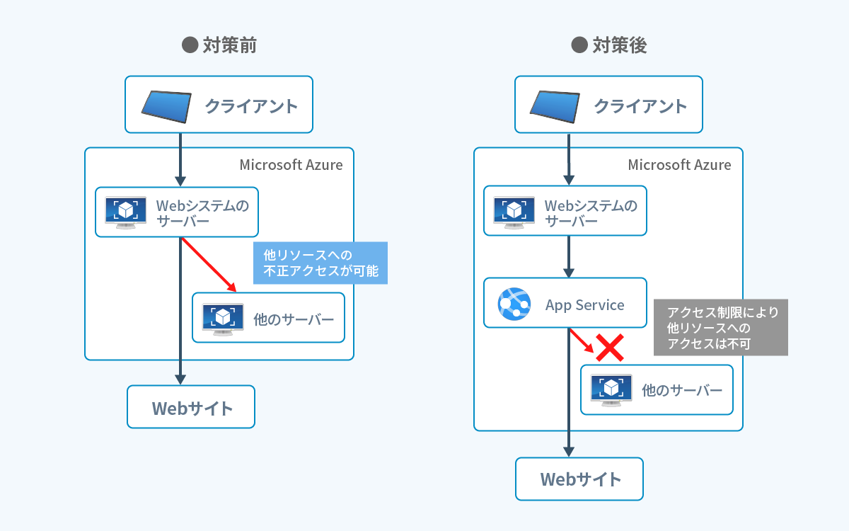 加えて、App Serviceに対してアクセス制限を設定し、Azureの内部リソースへのアクセスを禁止することで、もし悪意のある攻撃者が内部リソースのURLを入力したとしてもアクセスが不可能なため攻撃を防ぐことができます。