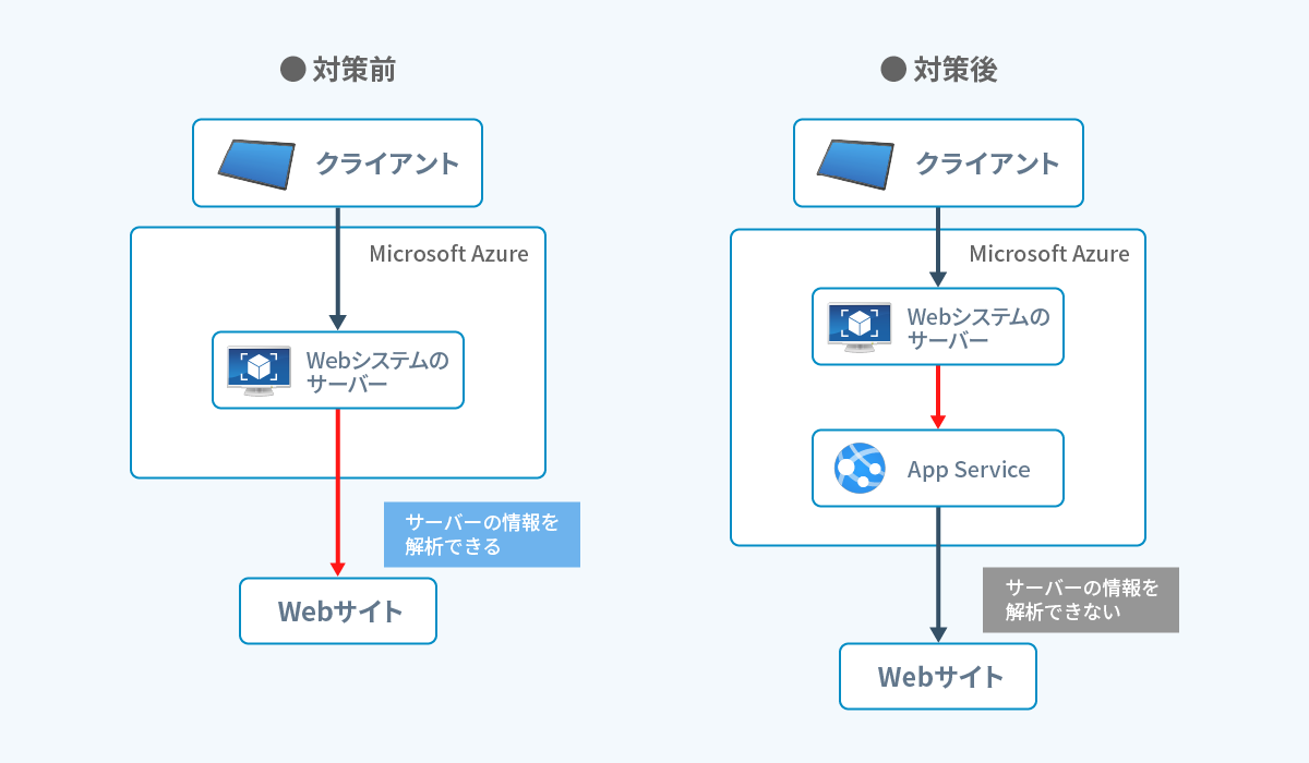 また、App Serviceを介してWebサイトにアクセスが行われることにより、要求の実態となるWebシステムのサーバーの情報が直接露出しなくなるため、情報漏洩の懸念を緩和することができます。