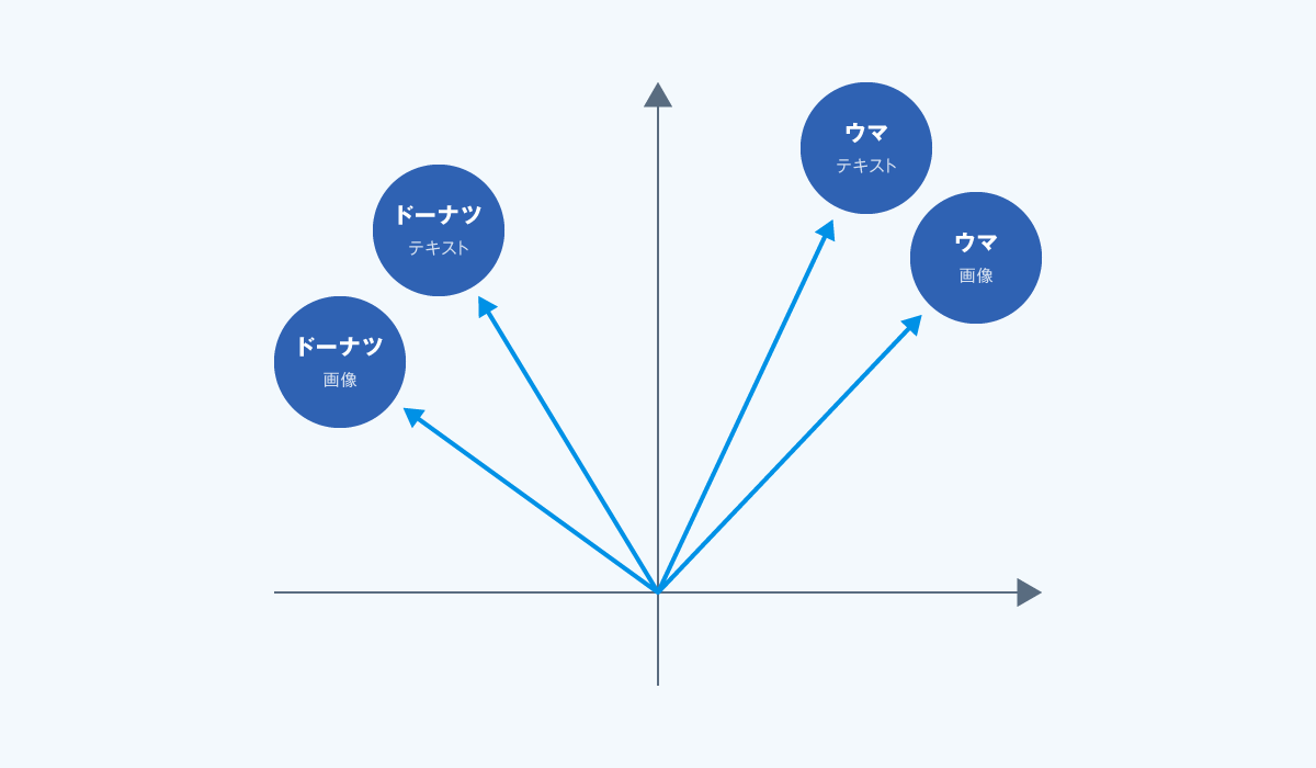 一方、「ドーナツ」というテキスト、またはドーナツの画像をベクトル化したものは、「ウマ」のベクトルとは離れた位置に配置されることになります。