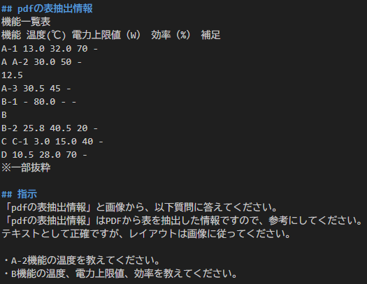 次に、表と表から抽出したテキスト情報をセットで、Claude 4へ投げる手順と結果を記載します。