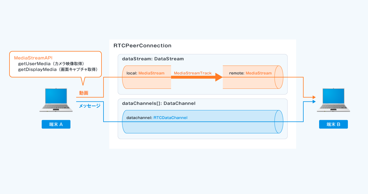 WebRTCの通信の核は RTCPeerConnectionです。これは「ブラウザ同士を直接つなぐオブジェクト」で、内部では映像や音声の圧縮・転送・再送制御などを行っています。そして、実際の映像や音声の“中身”を持つのがMediaStreamです。