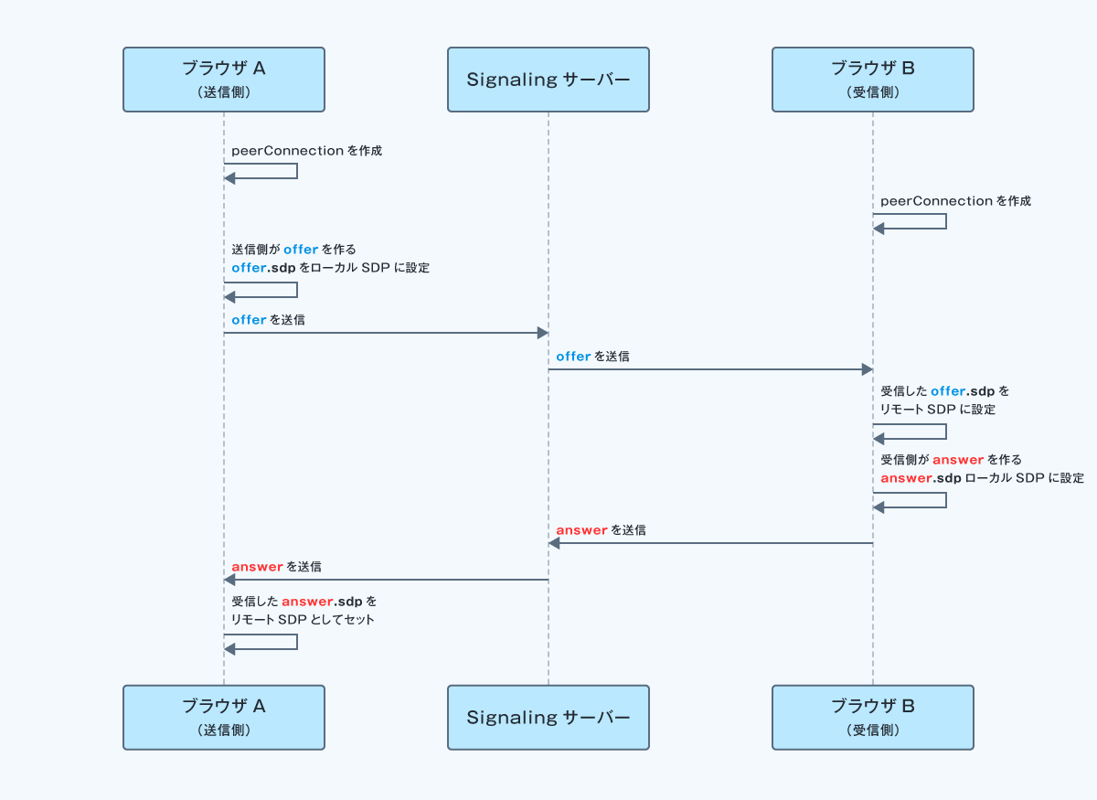 送信側はSignalingサーバー経由でSDPを受信側へoffer(提案)として送信します。受信側はSDPを受け取った後、自分側の設定情報をanswer(応答)として返します。