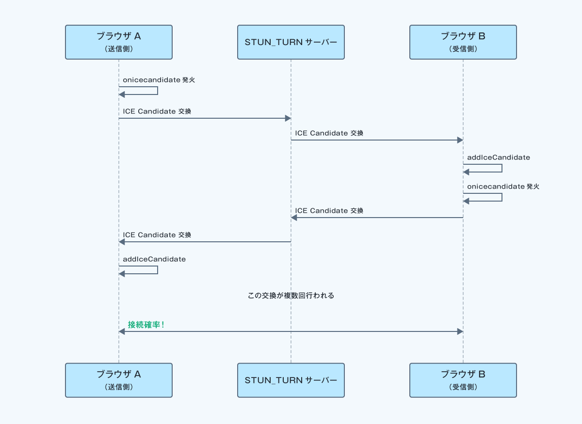 この一連の流れは、ブラウザ内部では非同期で進行しており、 どのタイミングでCandidateが届くかなどはネットワーク状況によって変わります。