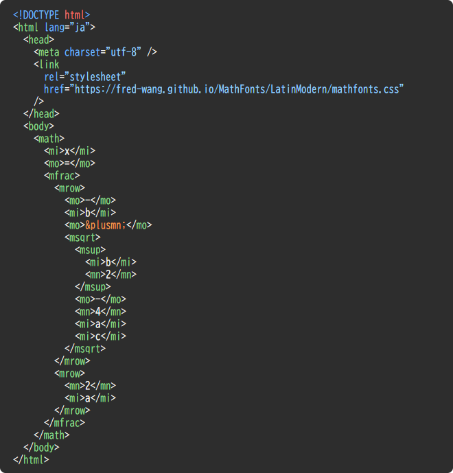 数式はHTML5で標準化されているMathMLを用いて表示することができます。