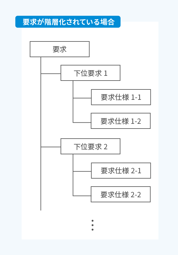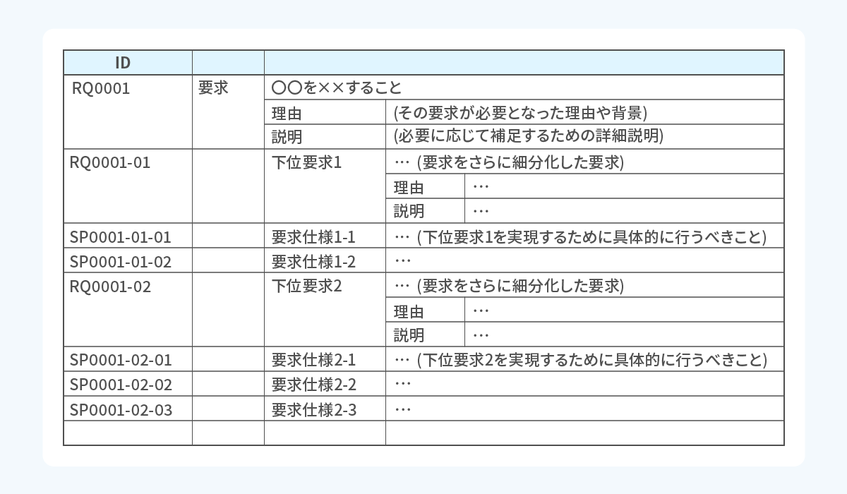 これは、各要求や要求仕様に独立したIDを振ることができるので、この要求仕様から作成される設計書やソースコードなどのドキュメント類と対応させることができ、管理もしやすくなります。