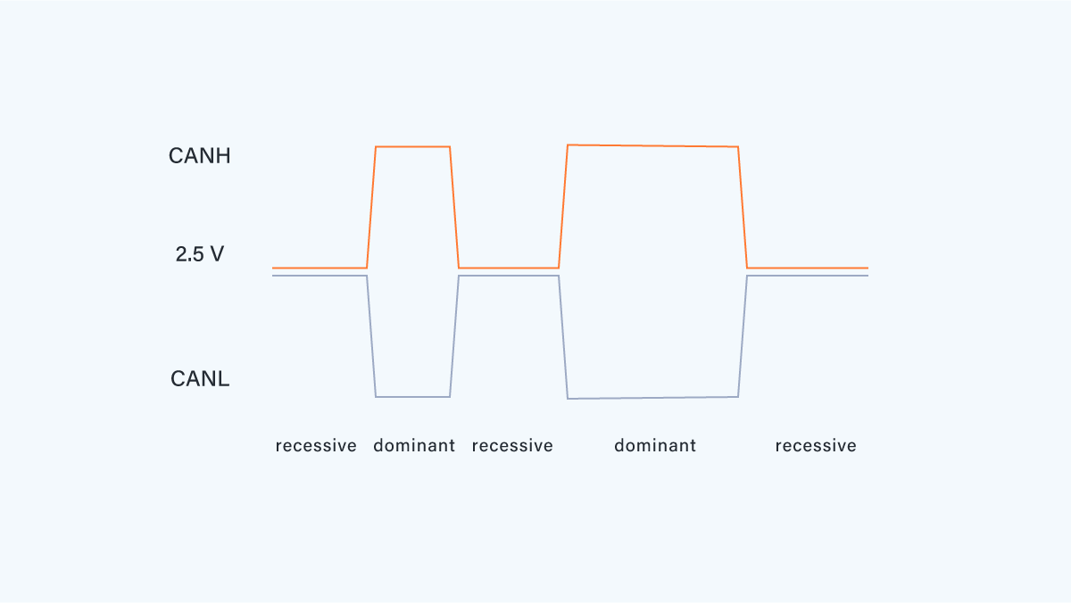 CAN通信では、CANHとCANLの差分によって、通信状態を決定します。CANH、CANLの差分が無い状態をレセシブ(1)、差分がある状態をドミナント(0)として扱います。