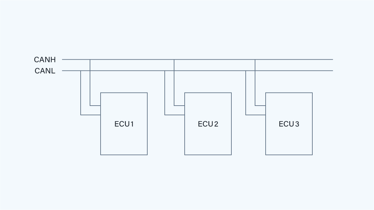 2線式のバス型ネットワークとなっており、1つのCANバスに複数のECUをつなげる事が可能です。